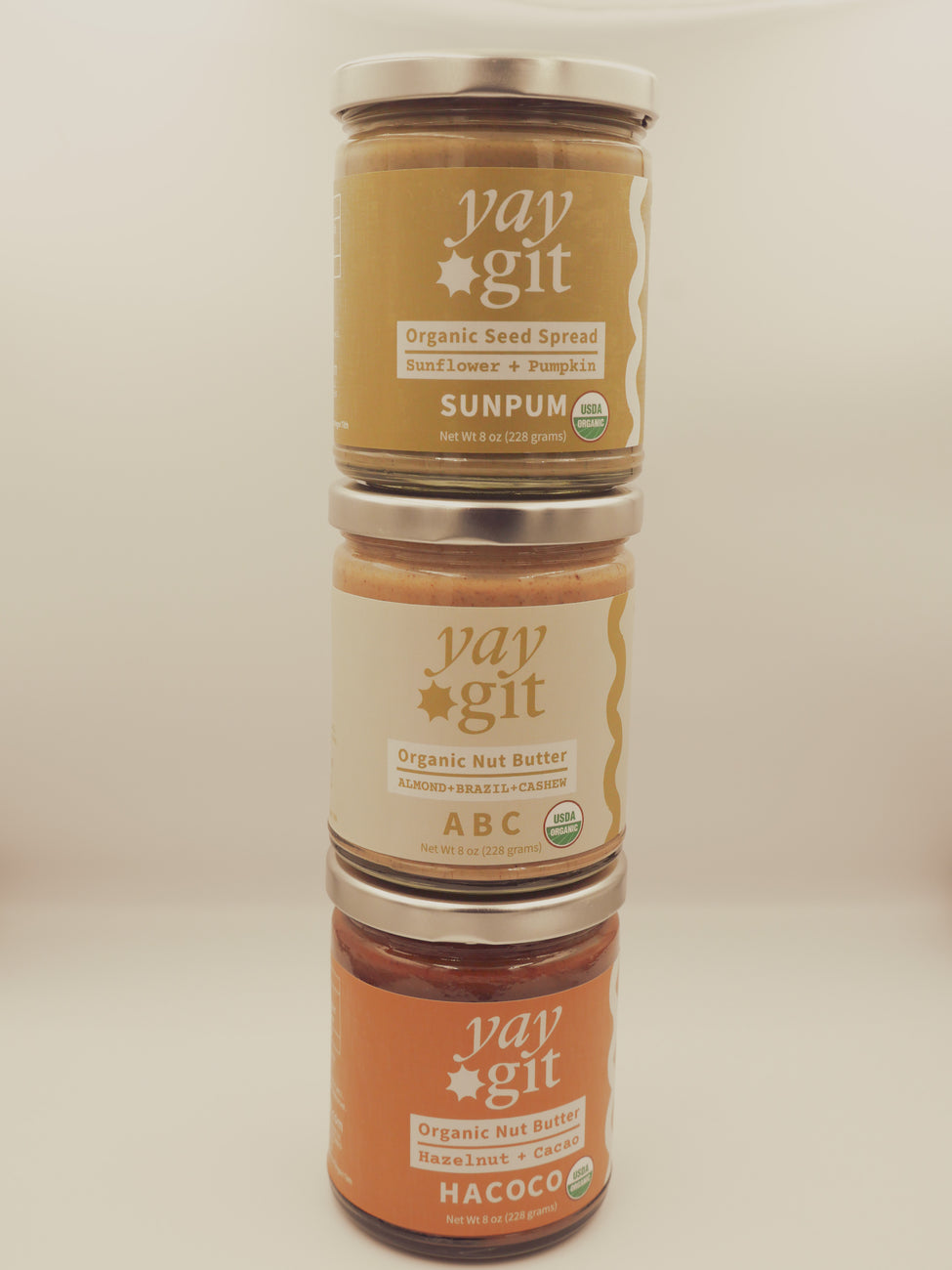 Yaygit nut and seed butters are truly, holistic, soothing and supportive. We offer our product in wholesale retail sizes and in bulk for restaurant style usage. What we can say about our product is that our carefully crafted butters are unique. We love to feed you. For interest in stocking contact us at info@yaygit.com. Purchase online here